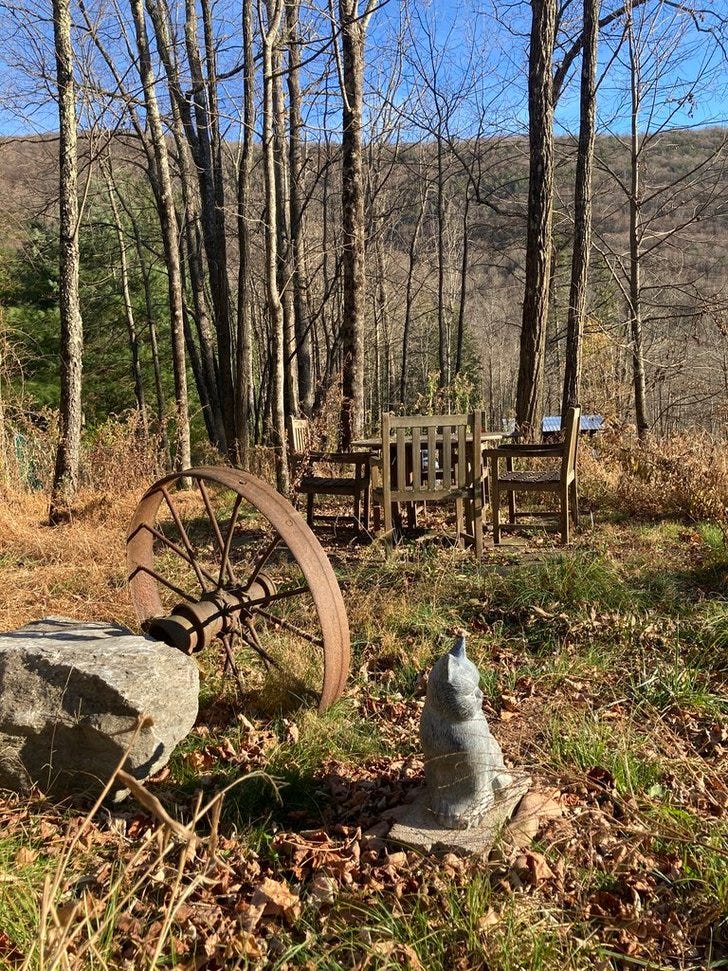 She died at the vet by lethal injection because of her cancer a day before we were scheduled to go camping in the Catskills. We decided to bring her “remains” (a full-fledged cat) to bury on our own land upstate on the way. Don’t tell my kids, but this required (since it was summertime) stowing her—in a bag in the blanket she died in—in the freezer overnight. I didn’t want anyone to complain about any smells on our road trip. In the morning we drove to our land and started digging alongside her in a cardboard box. My kids composed cards for her and brought along one of her toys. Of course it’s difficult to dig in this rocky dirt, but I made a big enough hole and we had a little ceremony, and laid our Poe, peacefully we thought, to rest. She was wrapped in the blanket she died in, because I couldn’t bear seeing her again in this way, wanting to remember her alive in her last moments rather than as a corpse. She had a great resting spot, capped with a cat statue, with a beautiful view, in a place she seemed to have enjoyed visiting a few times. She was even near a real cemetery here, so might have friends, if human. I didn’t imagine a fox would come and sit at the stone marking her spot, as if paying respects. My neighbor asked if we did something back there because that fox would hang out often. Yes, in fact, we buried our dear cat. RIP.