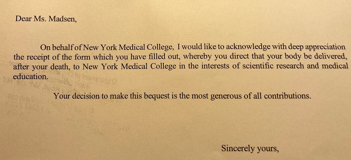 There’s an interesting conundrum I have to grapple with in my death packet. The two applications I have sent to a few nearby anatomical programs at medical colleges for the full-body donation soon boomeranged back with formal yet kind acceptance letters, like the oddest college admittance for old people: